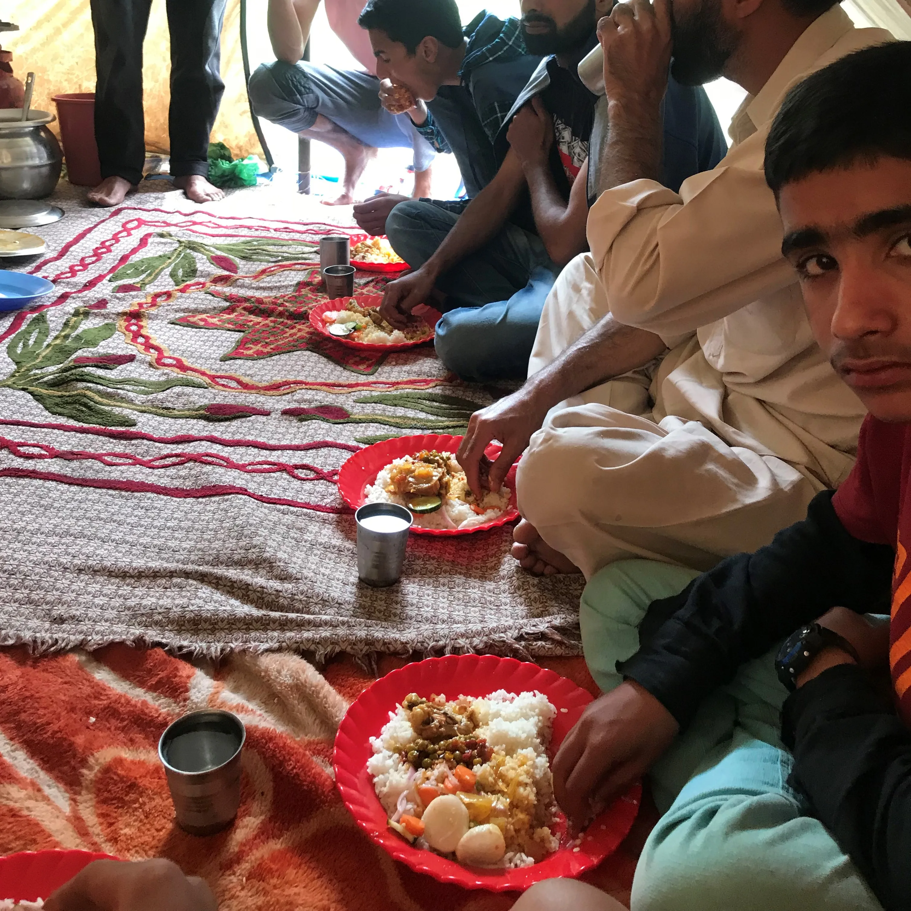 过了一会,一位穆斯林女人端进来一杯水,每个人轮流用右手在里面边蘸水边搓洗手指,原来是在我们享受音乐的时候,女主人们已经做好了午饭! 我实在是太过荣幸,能在开斋节里,在这迷人的克什米尔山谷,在这轰隆隆的河水边,在这当地穆斯林家庭的营帐里,吃上一顿地道的开斋节美餐!