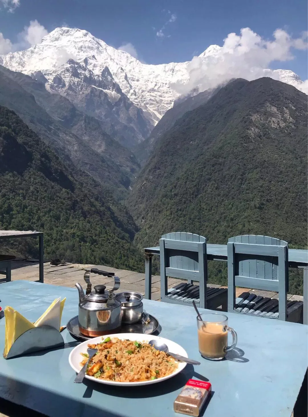 今天先是从Jhinu Danda往山上的Chhomrong爬,山体坡度非常大,也可能是前一天过度透支体力,花了两个小时上去。一上去就被雪山视野惊呆了,完全沉醉,于是当即决定不走了,就住在Chhomrong。是的,今天只走了两个小时,剩下时间都在与雪山对话。