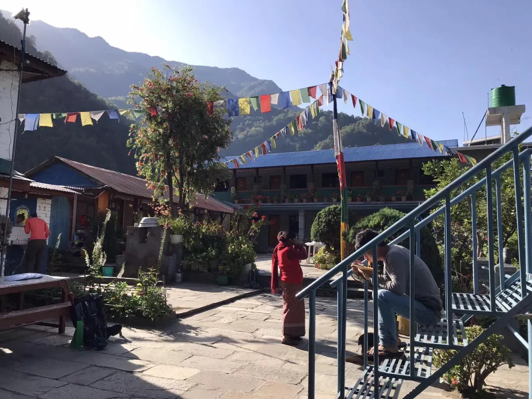 从Nanyapul走到Ghandruk山下才下午两点,大多数人第一天都是走到Ghandruk,我可能是脑子抽了,觉得时间还早,决定继续往前走,结果一直走到下午六点到达落脚点Jhinu Danda,非常累了,不建议这样做,学会放慢自己的脚步。
