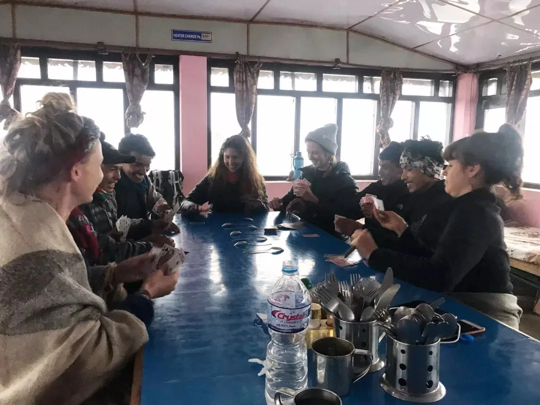 到达Himalaya,又累又冷,办住宿时碰到三个德国人,一聊天得知我明天计划到达ABC,很惊奇的问我能到吗?我说没问题,大概六七个小时就到了,旁边路线地图上也写了大概时间。再一问,原来他们向导告诉他们明天只能到EBC鱼尾峰大本营,从EBC到ABC还需要另外一天,然后我就明白了,是向导为了多赚一天的钱。到了吃晚饭时,晚饭吃的当地主食Dhal bhat,对面坐的他们向导,我猜他肯定对我不满意,因为我无意破坏了他多赚一天钱的计划,心里一直担心明天在路上他们会不会报复我啊……。 吃完晚饭和荷兰大哥在房子外面看云雾缭绕,聊到中国,称赞中国领导人有远见有计划,对中国的发展大加赞赏。