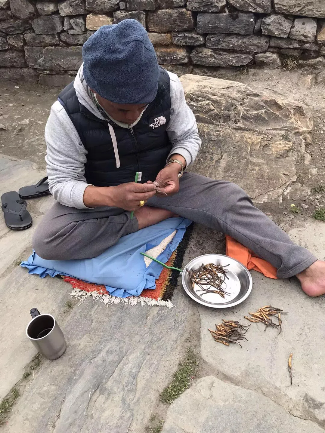 鱼尾峰大本营吃中午饭,碰到一个挖虫草的当地人,和他聊了很多,给我介绍了虫草分类和相应价值。问他卖给谁,卖给中国人。
